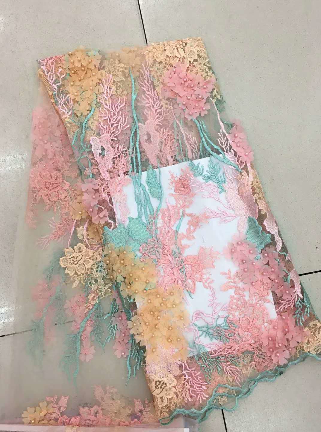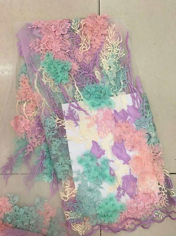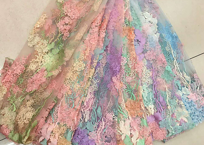 sind in über 30 Ländern auf der ganzen Welt beliebt3D-Perlen-Spitzenstoff, gewellter, mehrfarbiger, floral bestickter Stoff für Röcke